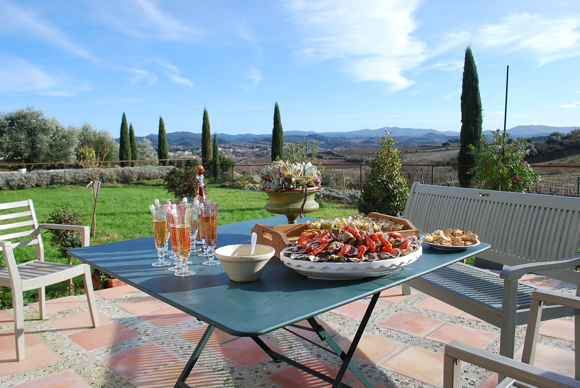 « Als plòs », sur le plateau qui domine Couffoulens, le gîte bâti entre deux moulins s’ouvre sur un admirable panorama : au-delà du vignoble et de la garrigue se dessinent les courbes bleutées des Corbières postées en avant-garde du massif pyrénéen dont les sommets bouclent l’horizon…